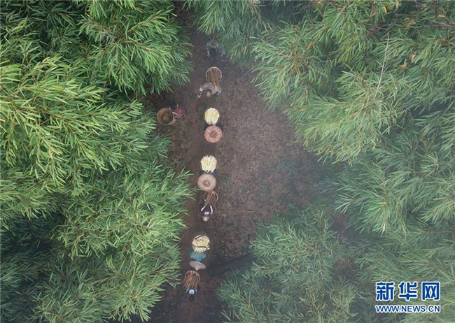 10月14日,在貴州赤水市寶源鄉(xiāng)聯(lián)華村,竹農(nóng)將采挖的竹筍背下山(無人機(jī)拍攝)。金秋時(shí)節(jié),貴州省赤水市寶源、兩河口、丙安等鄉(xiāng)鎮(zhèn)種植的5萬余畝大竹筍迎來收獲季。當(dāng)?shù)刂褶r(nóng)加緊采挖竹筍,進(jìn)行加工后外銷。素有“中國竹子之鄉(xiāng)”的赤水市,現(xiàn)有竹林面積132.8萬畝。竹產(chǎn)業(yè)已經(jīng)成為當(dāng)?shù)孛撠氃鍪盏闹饕乐弧?(王長育 攝)