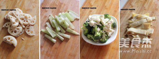 主料:雞翅中6個(gè) 大蝦6個(gè) 木耳60克 藕100克 豆皮100克 青筍200克 鮮香菇100克 西蘭花100克 菜花100克 金針菇1小把