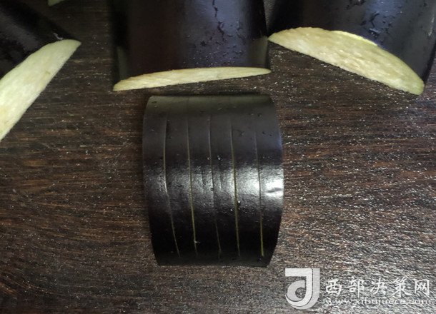 2.買回的大茄子洗凈,對(duì)半切開,取一半茄子先切6刀,前5刀不要切斷,第6刀切斷即可