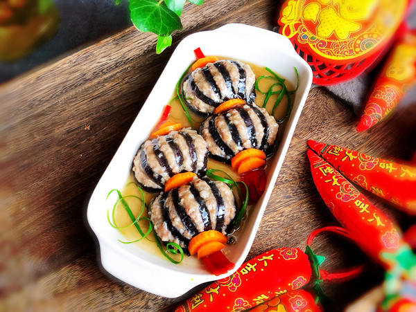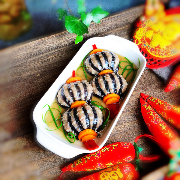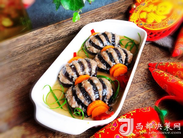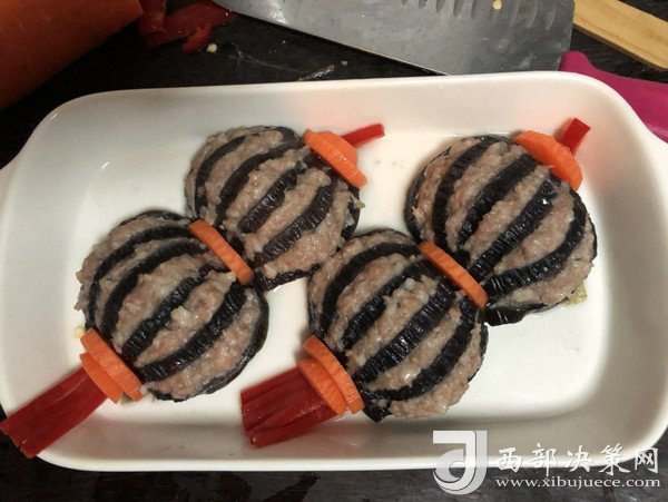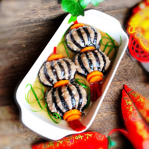 “今天買了一個(gè)大茄子,釀入豬肉餡,樣子像極了燈籠,如果你想顏色更深一點(diǎn),那就在調(diào)肉餡的時(shí)候加點(diǎn)老抽甚至加點(diǎn)紅曲粉,最后調(diào)澆汁的時(shí)候可以調(diào)成酸甜的番茄汁味,那就看起來(lái)更加的紅紅火火了。不過(guò)我還是比較喜歡這種小清新的風(fēng)格。這道菜一上桌,能把大魚大肉都比下去,好看好吃還喜慶。”
