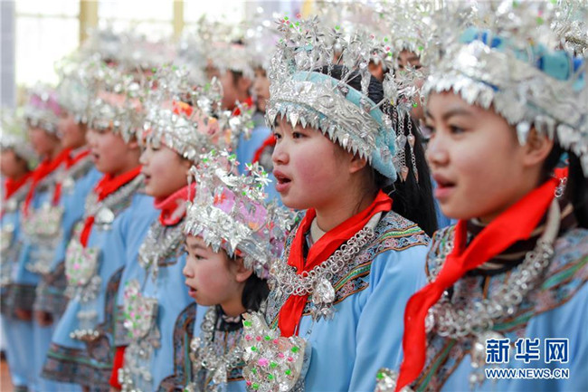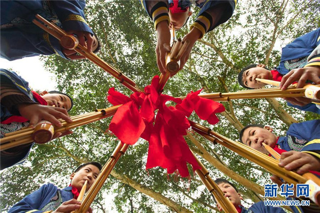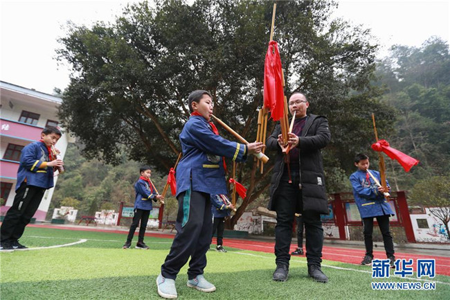 2月26日,榕江縣水尾水族鄉(xiāng)中心學(xué)校的學(xué)生在吹奏蘆笙。近年來,貴州省黔東南苗族侗族自治州榕江縣水尾水族鄉(xiāng)倡導(dǎo)水族文化進(jìn)校園,深受學(xué)生喜愛。新華社記者劉續(xù)攝