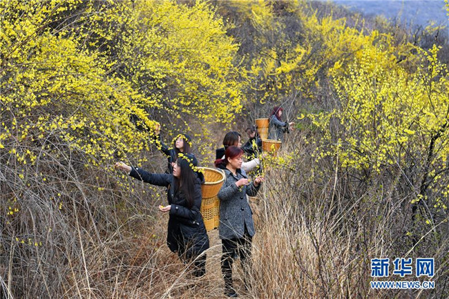 4月10日,平定縣冠山鎮(zhèn)后溝村的村民在采摘連翹葉。