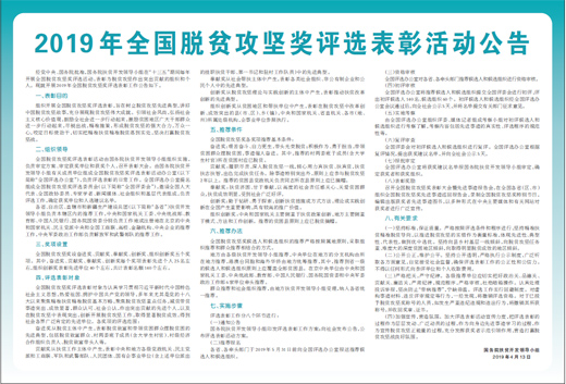 經(jīng)黨中央、國務(wù)院批準,國務(wù)院扶貧開發(fā)領(lǐng)導小組在“十三五”期間每年開展全國脫貧攻堅獎評選活動,表彰為脫貧攻堅作出突出貢獻的組織和個人。現(xiàn)就開展2019年全國脫貧攻堅獎評選表彰工作公告如下。