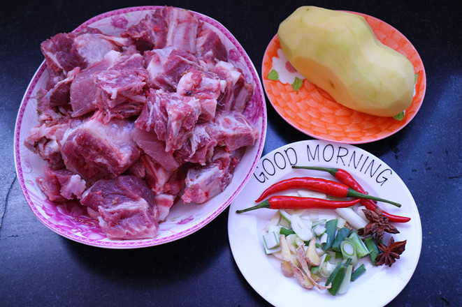 1.準(zhǔn)備食材:排骨一斤,土豆一個(gè),蔥姜段少量,八角兩粒,紅辣椒2.3個(gè)