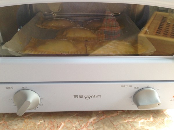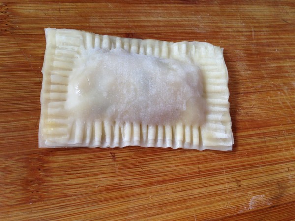 9.上面蓋上一組餛飩皮,四周壓緊粘合用叉子壓出花紋