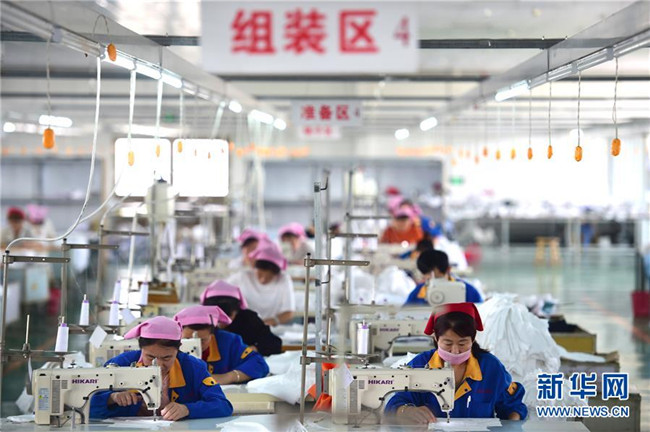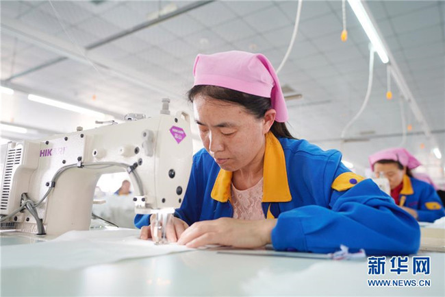5月16日,鹽山縣慶云鎮(zhèn)村民在凱瑞斯服裝廠工作。該服裝廠總部位于雄安新區(qū)容城縣,為配合雄安新區(qū)產(chǎn)業(yè)轉(zhuǎn)型升級,于2018年初來到河北省鹽山縣開設(shè)工廠。新華社記者 邢廣利 攝