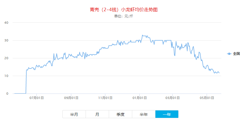 5月23日發(fā)布的一年期全國小龍蝦批發(fā)價(jià)走勢(shì)圖 圖片來源:小龍蝦價(jià)格網(wǎng)