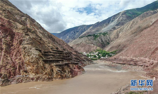 這是位于瀾滄江畔的西藏芒康縣納西民族鄉(xiāng)加達(dá)村的鹽田(6月4日無(wú)人機(jī)拍攝)。新華社記者晉美多吉攝
