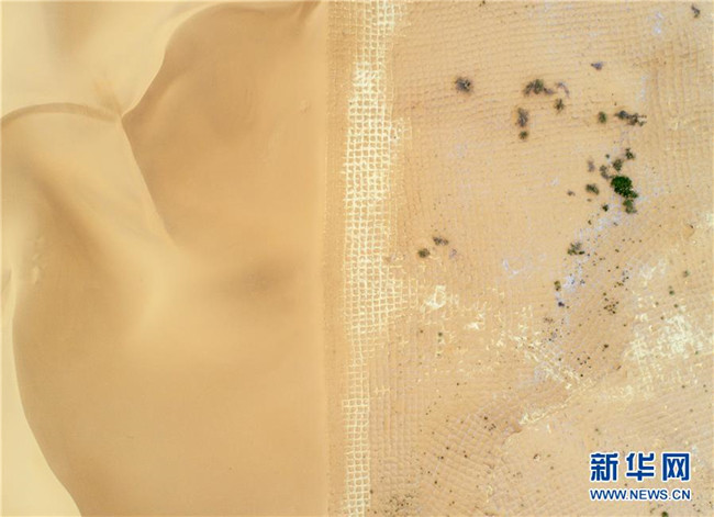 寧夏中衛(wèi)市長流水沙區(qū),一邊是沙漠,另一邊是用草方格治理后已生長出植被的區(qū)域(6月12日無人機(jī)拍攝)。新華社記者馮開華攝
