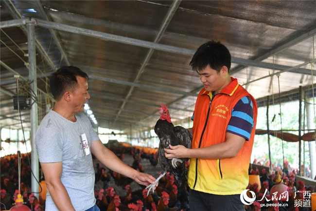 潞城瑤族鄉(xiāng)豐防村黨支部書記梁少生對養(yǎng)殖雞進行悉心管護