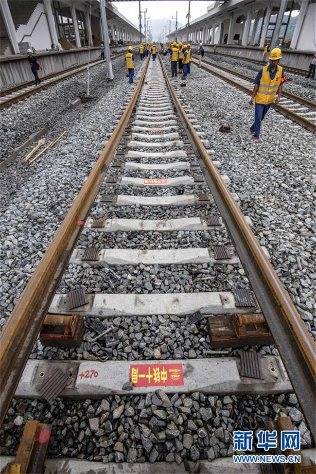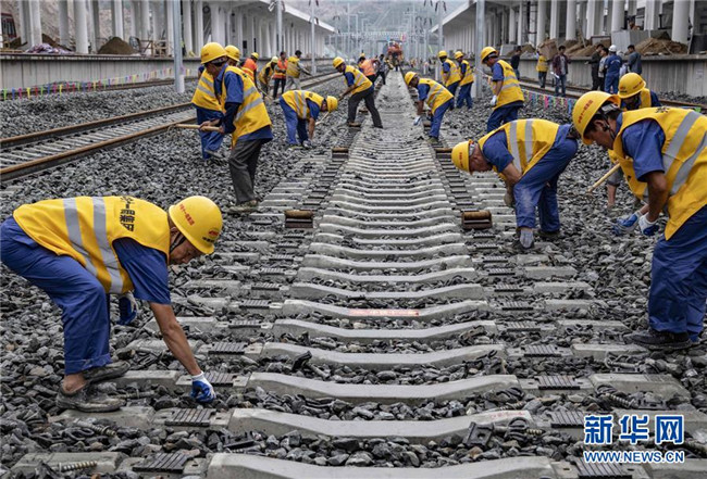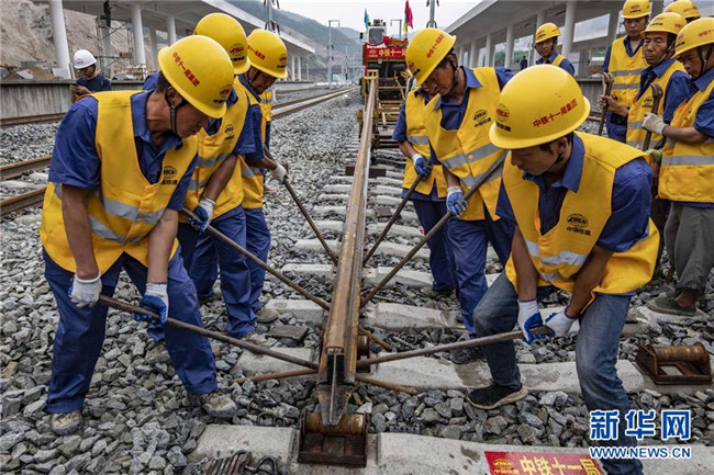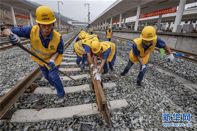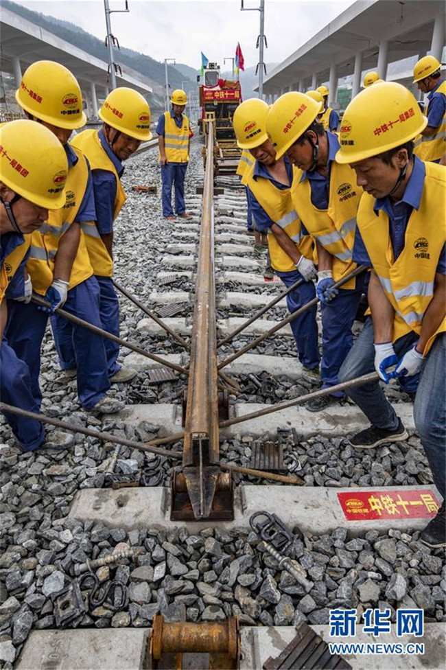6月22日,中鐵十一局三公司職工在湖北省十堰市十堰北站鋪設(shè)漢十高鐵最后一組500米長(zhǎng)軌。新華社記者 杜華舉 攝