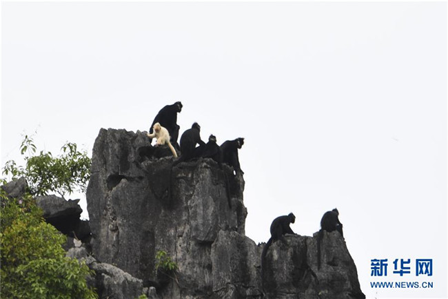 7月4日,白化黑葉猴幼體和同種群其他黑葉猴出現(xiàn)在廣西大新縣桃城鎮(zhèn)寶新村城南小學(xué)后山上。新華社記者 曹祎銘 攝