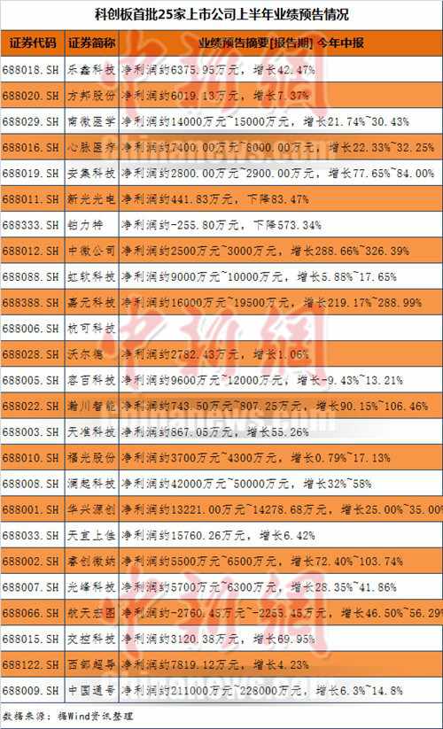 科創(chuàng)板首批25家上市公司上半年業(yè)績預告情況。制表:程春雨