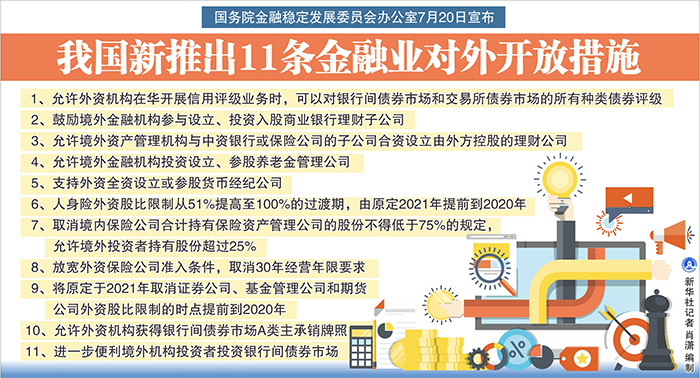 國務(wù)院金融穩(wěn)定發(fā)展委員會辦公室20日對外宣布,為貫徹落實黨中央、國務(wù)院關(guān)于進一步擴大對外開放的決策部署,按照“宜快不宜慢、宜早不宜遲”的原則,在深入研究評估的基礎(chǔ)上,推出以下11條金融業(yè)對外開放措施: