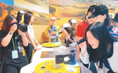 在內(nèi)蒙古恩格貝沙漠博物館(科學(xué)館),華文媒體代表用顯微鏡觀察沙粒。