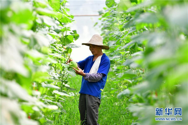 在廣西融安縣大良鎮(zhèn)古蘭村古蘭屯大棚基地,62歲的黃顯亮查看甜瓜生長情況(8月18日攝)。黃顯亮是大棚基地的技術(shù)員,每個月有3000多元的工資,已于2018年實現(xiàn)脫貧。  新華社記者 黃孝邦 攝