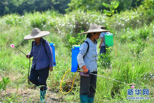 在廣西融安縣大良鎮(zhèn)古蘭村古蘭屯金桔種植基地,村民在田間管護金桔樹(8月18日攝)。  新華社記者 黃孝邦 攝