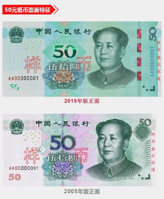 此外,2019年版第五套人民幣50元、20元、10元、1元紙幣調(diào)整正面毛澤東頭像、裝飾團(tuán)花、橫號(hào)碼、背面主景和正背面面額數(shù)字的樣式,增加正面左側(cè)裝飾紋樣,取消正面右側(cè)凹印手感線和背面右下角局部圖案,票面年號(hào)改為“2019年”。