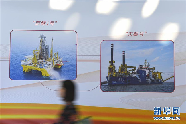 10月15日,與會者經(jīng)過“藍鯨1號”鉆井平臺與“天鯤號”自航絞吸挖泥船展板。 新華社記者毛思倩攝