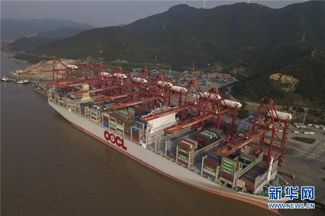 一艘貨輪??吭趯幉ㄖ凵礁鄞┥礁蹍^(qū)集裝箱碼頭(2018年6月13日無(wú)人機(jī)拍攝)。新華社記者 黃宗治 攝