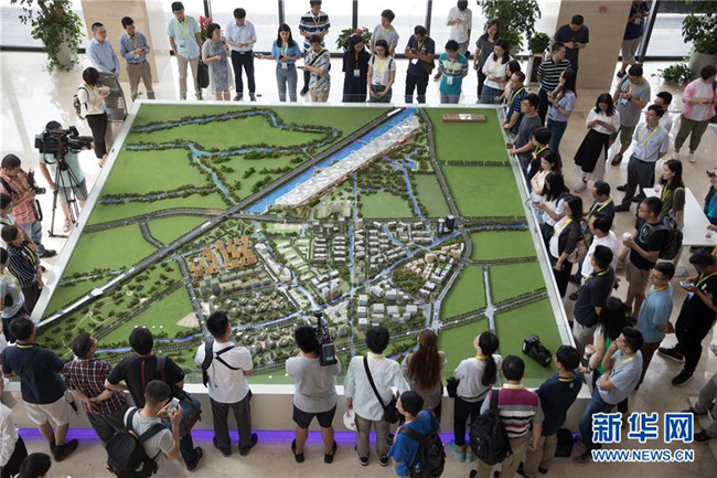 在上海臨港松江科技城沙盤(pán)前,參觀者聽(tīng)取建設(shè)規(guī)劃(8月13日攝)。 G60科創(chuàng)走廊是利用長(zhǎng)三角區(qū)位優(yōu)勢(shì)、良好的產(chǎn)業(yè)基礎(chǔ)和高??蒲袡C(jī)構(gòu)集中等特點(diǎn)打造的區(qū)域協(xié)同創(chuàng)新發(fā)展的重要平臺(tái),將成為長(zhǎng)三角更高質(zhì)量一體化發(fā)展的重要引擎。新華社記者 金立旺 攝