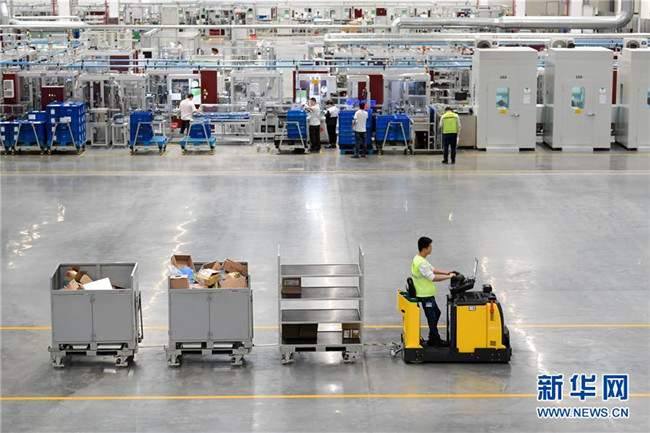江蘇太倉(cāng)博澤汽車部件有限公司工作人員在生產(chǎn)車間運(yùn)輸產(chǎn)品(10月30日攝)。新華社記者 李博 攝