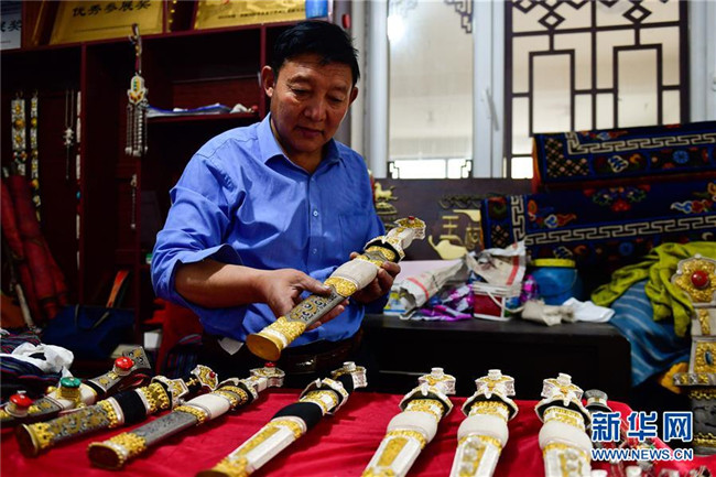 青海省玉樹藏族自治州的芒擦藏刀工藝距今已有上百年歷史。煅制芒擦藏刀需要特殊的材料、具備精湛的技藝,常用到金、銀、紅銅、黃銅、木材、鐵、牛角等材料,煅制工藝復(fù)雜。芒擦藏刀樣式精美,受到海內(nèi)外游客歡迎。