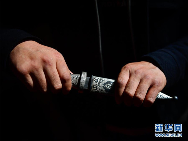 11月17日,芒擦藏刀匠人更求彭措在試藏刀刀身與刀鞘的契合度。新華社記者 張龍 攝