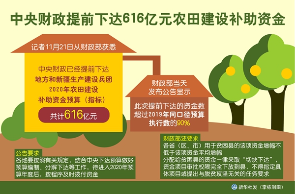 圖表:中央財政提前下達616億元農(nóng)田建設(shè)補助資金 新華社發(fā) 李棟 制圖