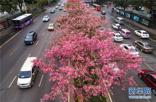 這是美麗異木棉花競(jìng)相綻放的廣西柳州市東環(huán)大道(12月1日無(wú)人機(jī)拍攝)。 新華社記者 黃孝邦 攝