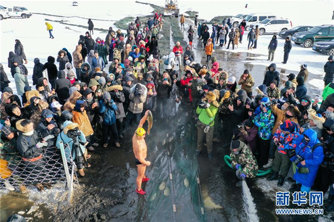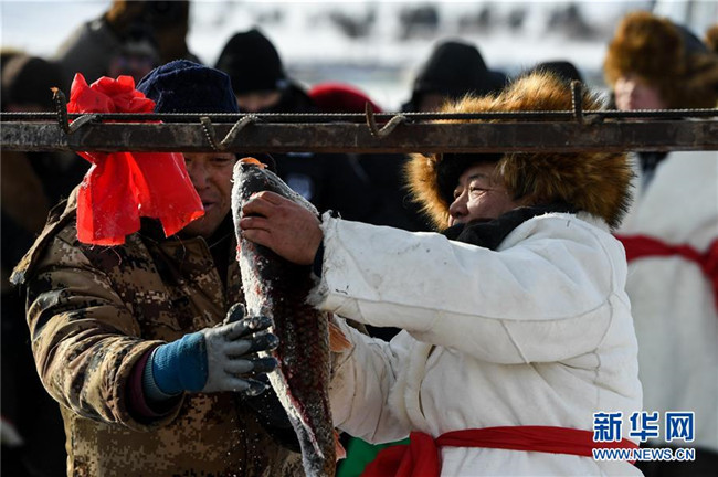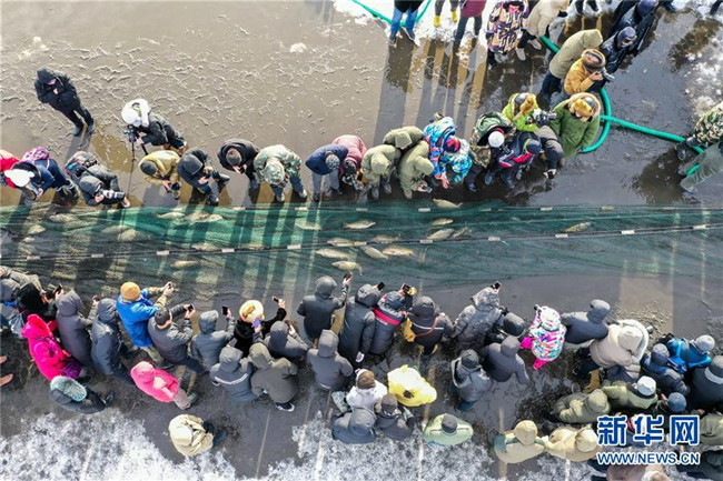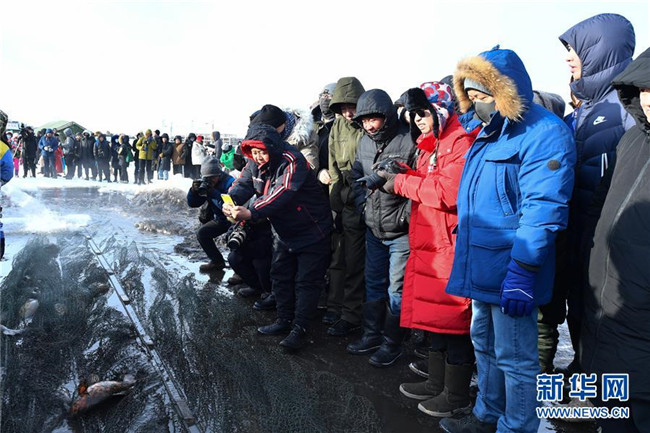 當(dāng)日,位于內(nèi)蒙古呼倫貝爾大草原上的諾干湖舉行冬捕活動(dòng),吸引不少游客前來(lái)觀看。冬日的諾干湖冰雪覆蓋,諾干湖冬捕也是當(dāng)?shù)囟韭糜蔚奶厣顒?dòng)之一。