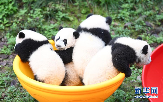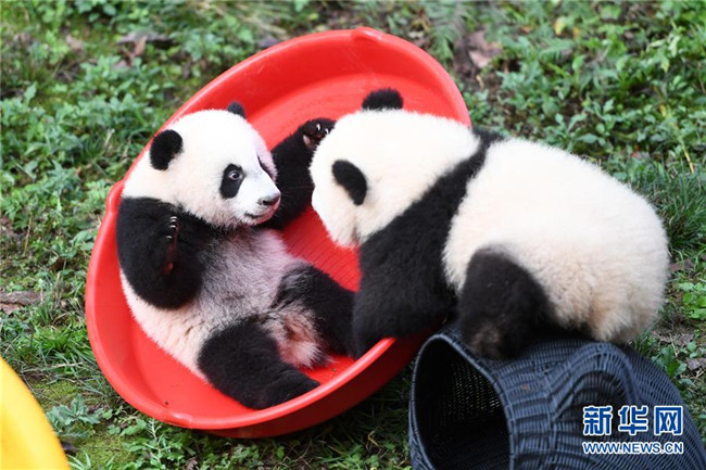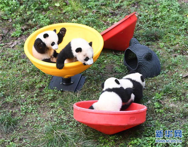 12月22日,重慶動(dòng)物園4只半歲大熊貓?jiān)谕嫠?。?dāng)日,重慶動(dòng)物園為4只大熊貓寶寶“雙雙”“重重”“喜喜”“慶慶”舉行半歲生日慶?;顒?dòng)。4只半歲大熊貓?jiān)陲曫B(yǎng)員的照料下,在熊貓館運(yùn)動(dòng)場內(nèi)玩耍、嬉戲,與市民游客一同過冬至。新華社記者唐奕攝