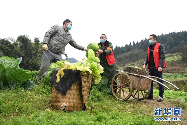 2月8日,菜農(nóng)(左)和鄉(xiāng)村蔬菜配送小隊(duì)志愿者在搬運(yùn)蔬菜。 新華社記者 唐奕 攝