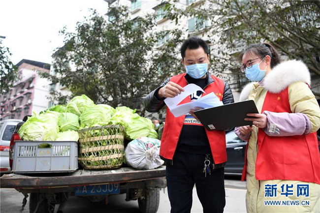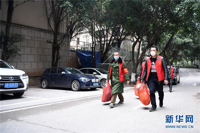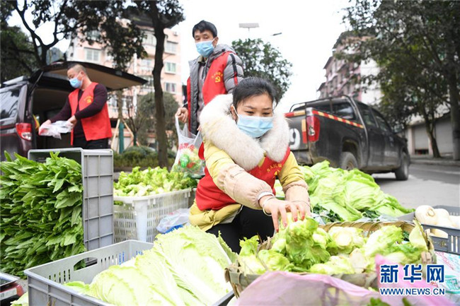 2月8日,詹成偉(前右)和志愿者準(zhǔn)備將新鮮蔬菜送至小區(qū)。 新華社記者 唐奕 攝