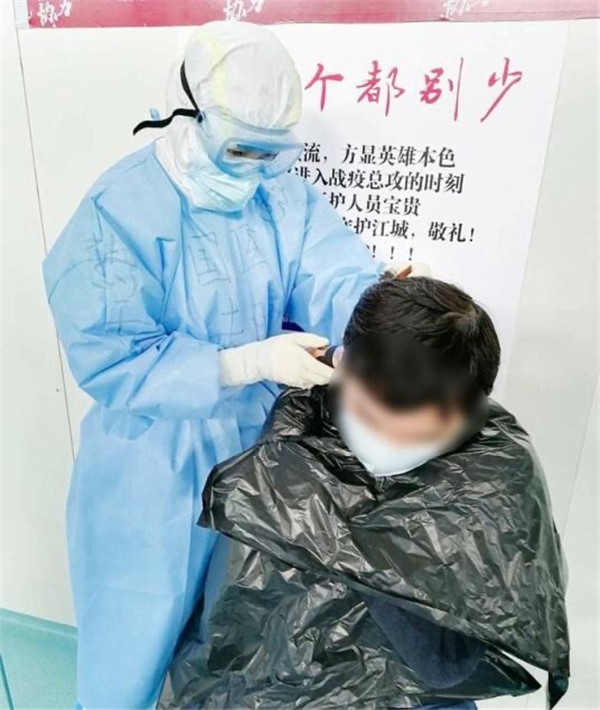 1艙有康復(fù)人員想理發(fā),手頭沒有工具,朱晴護士長得知后,聯(lián)系下個班次護士帶來推子,給大家理發(fā)。“看你動作很嫻熟啊,以前練過的吧”,“圍觀群眾”打趣道。“現(xiàn)學現(xiàn)賣,大家要求不要太高,有壓力?。?rdquo;朱晴說。一直推到推子沒電,朱晴給6位康復(fù)人員簡單修剪了頭發(fā)。得知朱晴是西安醫(yī)療隊的護士,大家都親切的稱她“肉夾饃”!