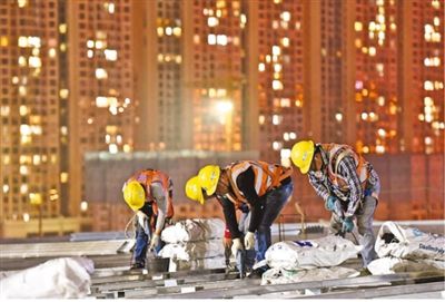 近日,在廣西柳州柳東新區(qū)國(guó)際會(huì)展中心三期項(xiàng)目工地,夜班工人在屋面作業(yè)。 黎寒池?cái)z(影像中國(guó))