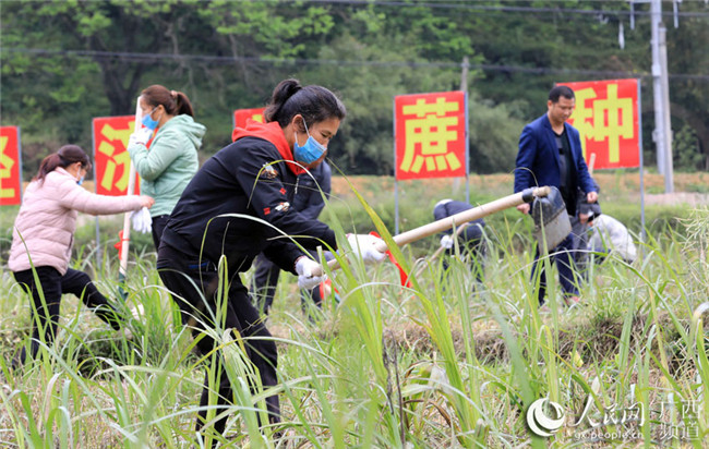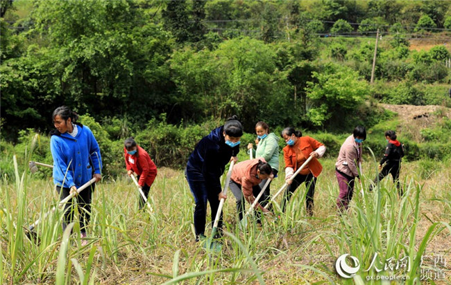 在廣西柳州市融安縣沙子鄉(xiāng)紅妙村,勞務(wù)隊成員在村集體經(jīng)濟甘蔗示范點勞作。譚凱興攝