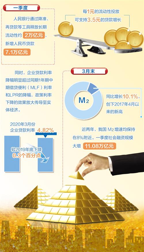 從引導(dǎo)貸款投放看,一季度中國人民銀行通過降準(zhǔn)、再貸款等工具釋放長期流動(dòng)性約2萬億元,新增人民幣貸款7.1萬億元,每1元的流動(dòng)性投放可支持3.5元的貸款增長,是1∶3.5的倍數(shù)放大效應(yīng)。
