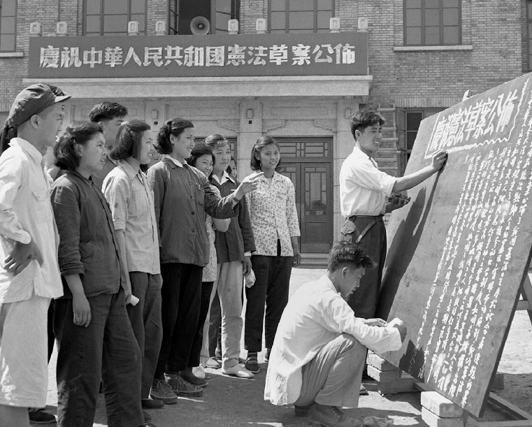 1954年6月,北京市各界人民熱烈擁護《中華人民共和國憲法草案》。圖為北京國營第一棉紡織廠工人們,獲悉《中華人民共和國憲法草案》公布的消息后,立刻出版黑板報宣傳。