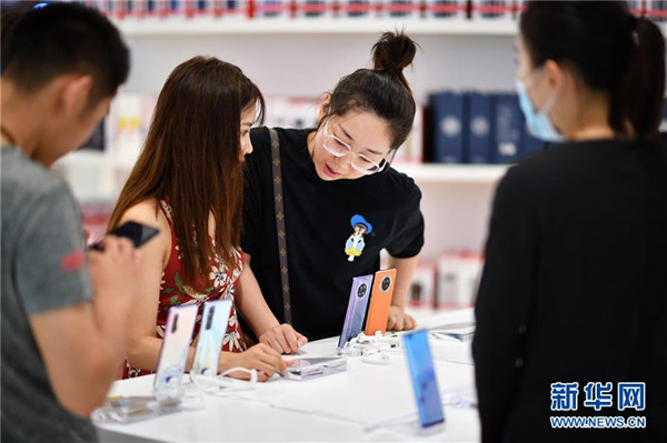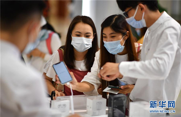 7月1日,顧客在??谌赵聫V場免稅店選購手機等電子消費產(chǎn)品。當日,海南開始實施調(diào)整后的離島免稅購物政策。海南離島旅客每年每人免稅購物額度提高至10萬元,電子消費產(chǎn)品等7類新增商品開售。新華社記者郭程攝