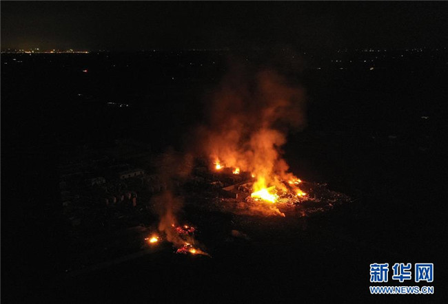 截至9日3時(shí),事故現(xiàn)場(chǎng)火勢(shì)已得到控制,但仍有明火。由于對(duì)爆炸品是否已燃完情況不明,救援人員通過(guò)無(wú)人機(jī)空中觀察,在警戒線外待命。