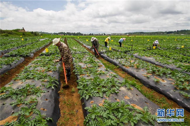 7月14日,村民在貴州省畢節(jié)市威寧縣草海鎮(zhèn)中海村的蔬菜基地里勞作。新華社發(fā)(羅大富 攝)