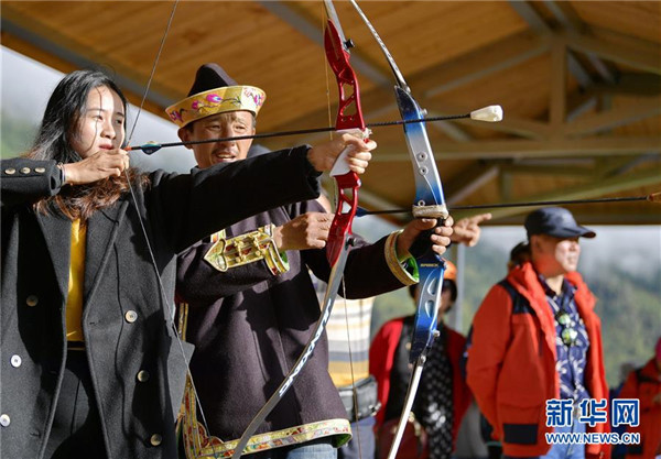 一名游客在當?shù)剞r(nóng)牧民的指導(dǎo)下射擊響箭(7月26日攝)。新華社記者張汝鋒攝