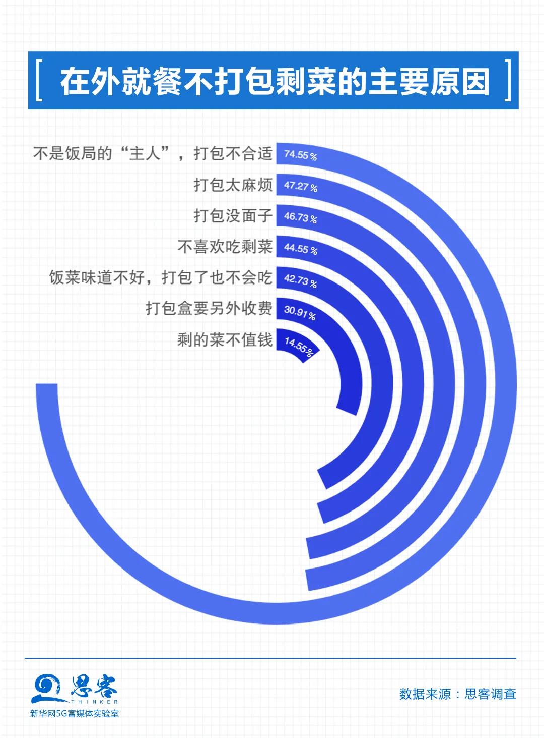 打包不合適、太麻煩、沒面子,這些是受訪者認為在外就餐不愿打包剩菜的主要原因。“我不是宴會的主辦者,我打包不合適,好像我占便宜似的”“同桌的人一起夾過的菜,打包不衛(wèi)生”“穿著西裝打著領(lǐng)帶,手上拿著打包盒很奇怪”“中午食堂的剩菜又沒有打包盒裝,下午又沒地方放,沒人會打包帶走”,這樣的受訪者留言在后臺還有不少。