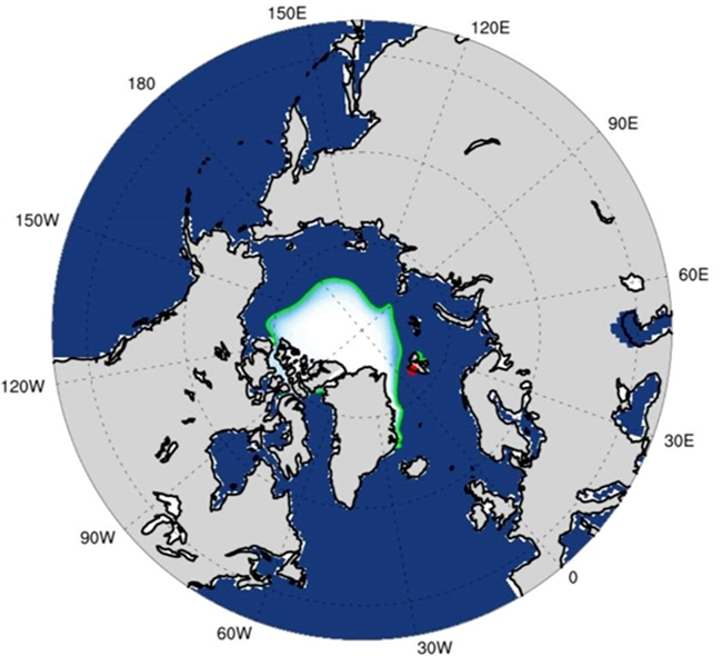▲中科院大氣物理研究所ANSO IAP-LASG北極海冰動(dòng)力集合預(yù)測系統(tǒng)6月份發(fā)布的9月份北極海冰范圍預(yù)測,綠色實(shí)線為預(yù)測的北極海冰范圍,白色區(qū)域?yàn)楹1鶇^(qū)域。圖片來源:中國科學(xué)報(bào)