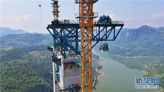 9月1日,工作人員在指揮主索鞍吊裝。新華社記者劉續(xù)攝