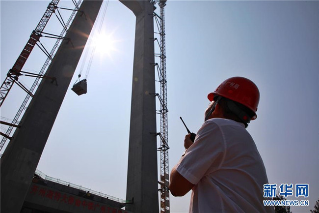 9月1日,工作人員在對主索鞍進(jìn)行吊裝。新華社記者劉續(xù)攝