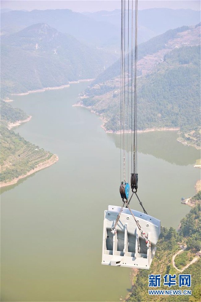 9月1日,工作人員在對主索鞍進(jìn)行吊裝(無人機照片)。新華社記者劉續(xù)攝