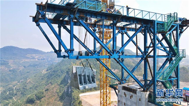 9月1日,工作人員在對主索鞍進(jìn)行吊裝(無人機照片)。 新華社記者劉續(xù)攝