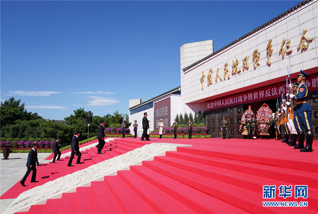 9月3日上午,習(xí)近平、李克強(qiáng)、栗戰(zhàn)書、汪洋、王滬寧、趙樂際、韓正、王岐山等黨和國(guó)家領(lǐng)導(dǎo)人來到中國(guó)人民抗日戰(zhàn)爭(zhēng)紀(jì)念館,出席紀(jì)念中國(guó)人民抗日戰(zhàn)爭(zhēng)暨世界反法西斯戰(zhàn)爭(zhēng)勝利75周年向抗戰(zhàn)烈士敬獻(xiàn)花籃儀式。 新華社記者 王曄 攝